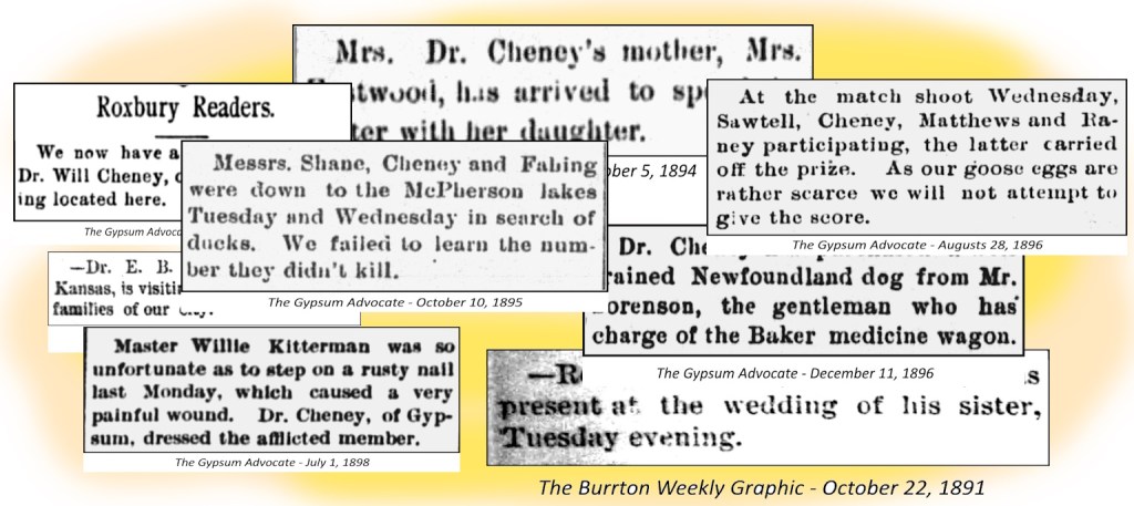 The 1890s are full of Cheney news and family events. Family visits. Crop reports. W.T. Cheney is active in local politics and Sunday School. Ralph and Mollie Cheney moved to Gypsum and are having kids.