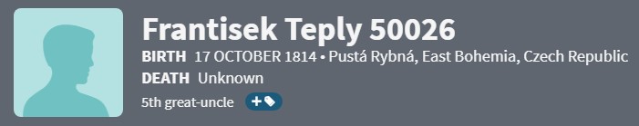 Ferdinand and Terezie Teply (5G) moved to Oldris 118 around 1840. They were retired, and lived with their son Frantisek and his family. Frantisek was the younger brother of Joseph (4G). Ferdinand and Terezie lived here over twenty years until their deaths in 1862 and 1866.