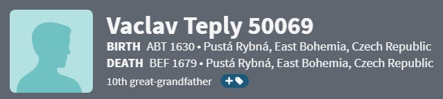 Our first documented family citation is 1653, when Jan was born to Vaclav and Vichla Teply. Vaclav and Vichla were likely born around 1630.
