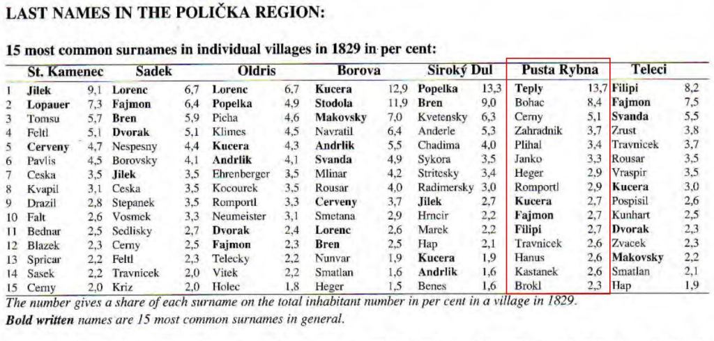 By 1829, Teply was the most common name in the village. Pustá Rybná and its suburbs had a population of about 1000. And about 140 were Teplys!