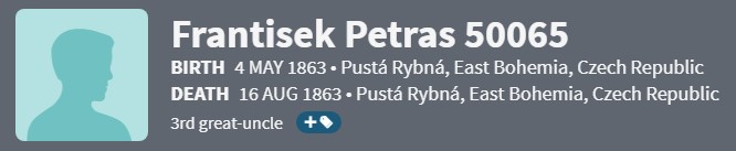 And once again, the child died. Frantisek died August 16 at 4 am, three months old. He was buried at Pustá Rybná on the 18th. Cause of death was “psotnik”. The register records “Antonin Frantisek illegitimate son of Josepha Petras…”