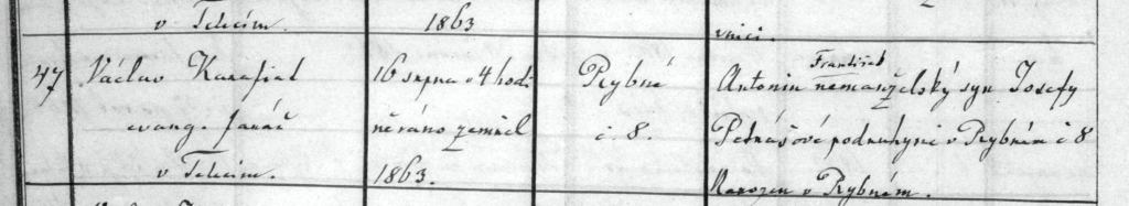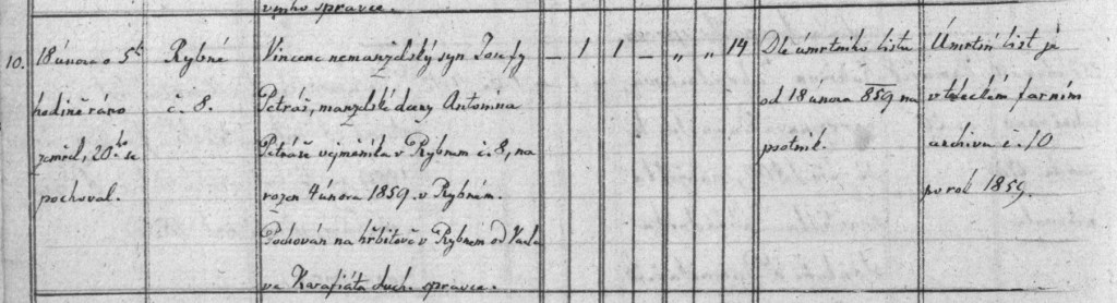 Here’s the death register for Vincenc, who died a few weeks after birth. He died on February 18 at five o’clock in the morning, and was buried at Pustá Rybná on the 20th. Cause of death was “psotnik”, which was used for almost any case of infant death. The register records “Vincenc illegitimate son of Josepha Petras…”