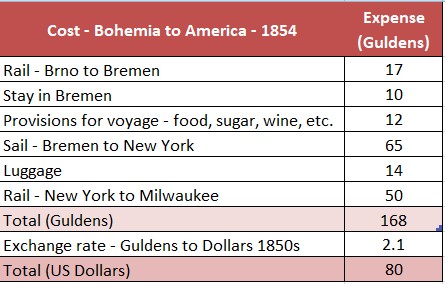 In 1854 a Moravian government official tallied the cost from Brno to New York. I added the cost from New York to Milwaukee. The total cost was about 170 guldens (about 80 dollars) per person.