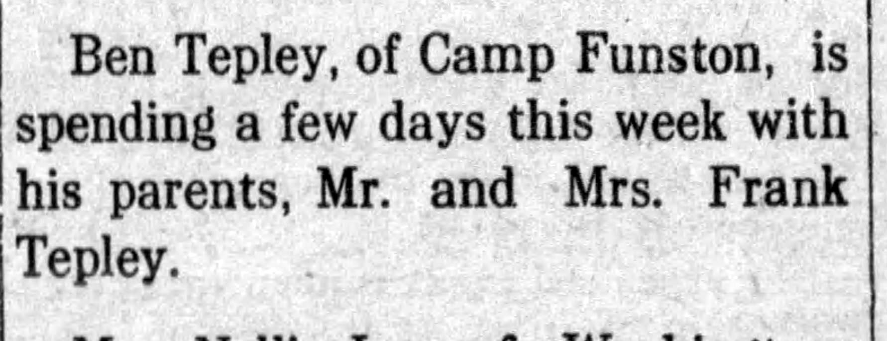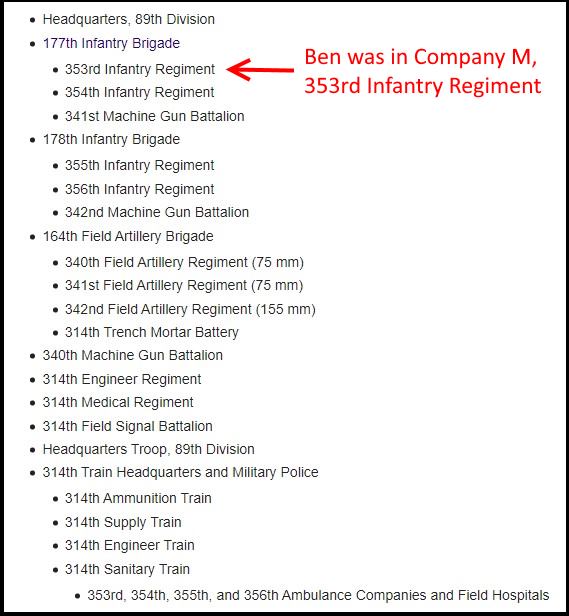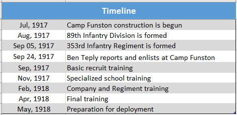 Ben Teply was one of those original recruits from Kansas. His enlistment record is dated September 24. He reported to Camp Funston and was assigned to the 353rd Infantry, Company M.