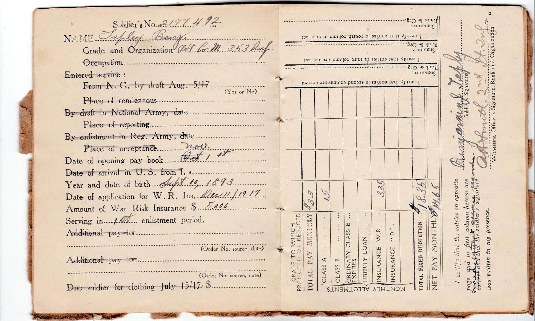 Ben Teply’s pay record showed that he had gross pay of $33 in December 1917. But he had deductions of $15.00 for Class A allotment and $3.35 for insurance, and thus net pay of $14.65.
