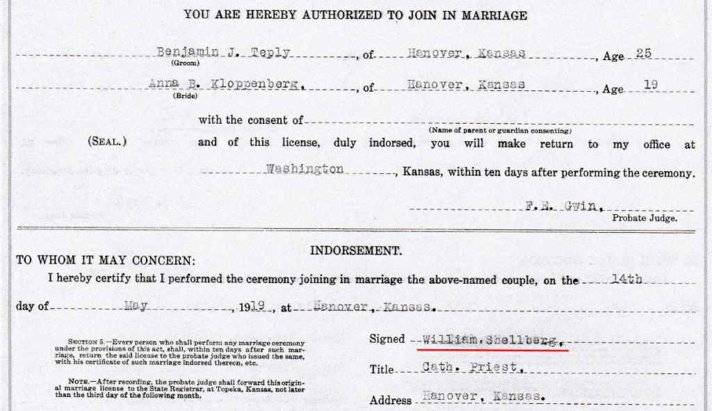 - Marriage License – Ben Teply and Anna Kloppenberg – 1919 – Marriage License Record, D – p. 226 – Washington County Kansas Courthouse