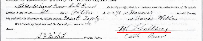 For example, he was the officiant at the marriage of Frank Teply and Anna Welter in 1892, and 27 years later at the marriage of Ben Teply and Anna Kloppenberg.
