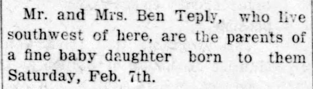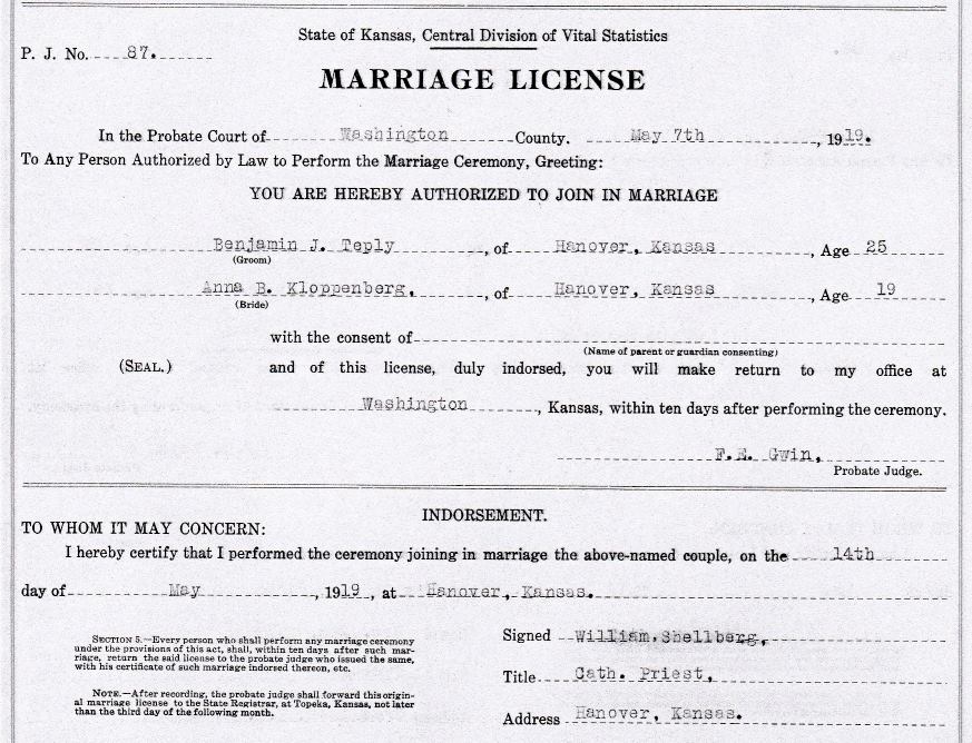 - Marriage license – Ben Teply and Anna Kloppenberg – Washington County District Court, Washington, Kansas