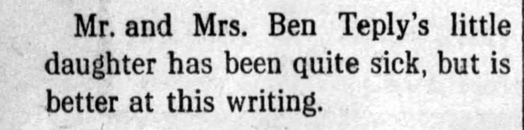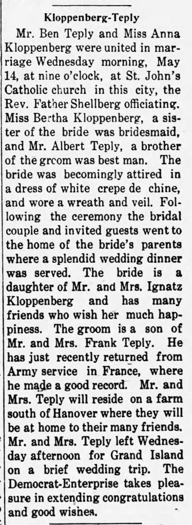 Ben Teply, 25, and Anna Kloppenberg, 19, were married May 14, 1919, at St. John’s Catholic Church in Hanover. Attendants were Albert Teply and Bertha Kloppenberg.