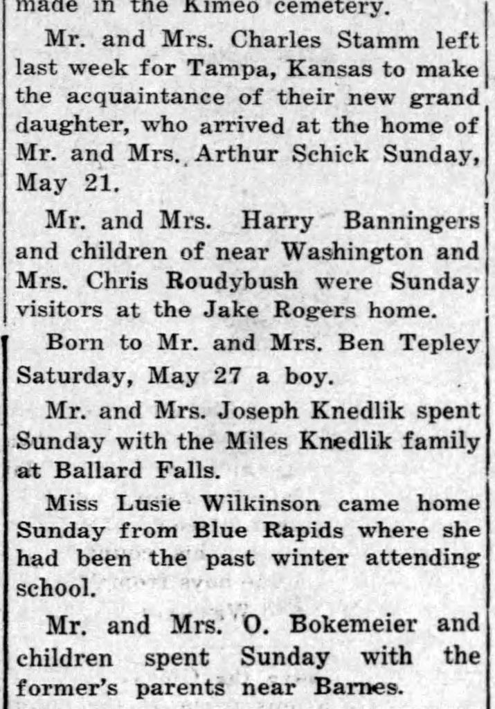 - All news articles are from The Hanover Democrat, The Hanover Herald, The Marysville Advocate, Washington Register. All are available on Newpapers.com and are free for Kansas residents – Kansas State Historical Society – https://www.kshs.org/ancestry/drivers/dlverify