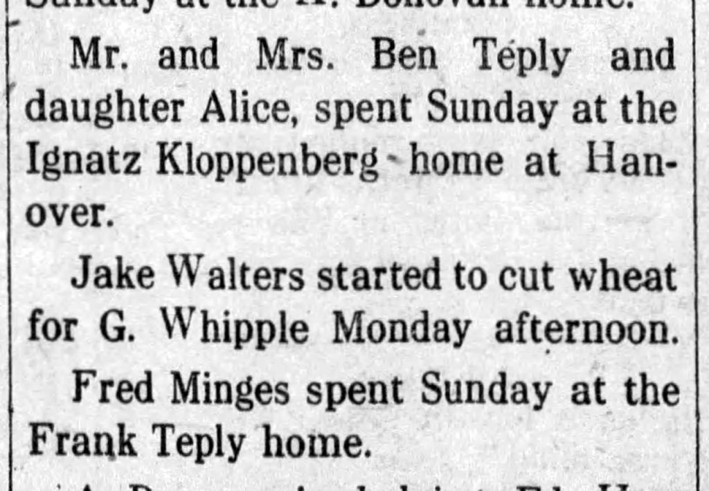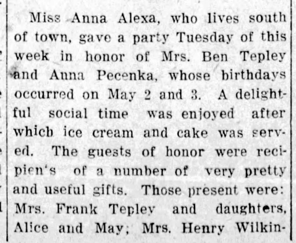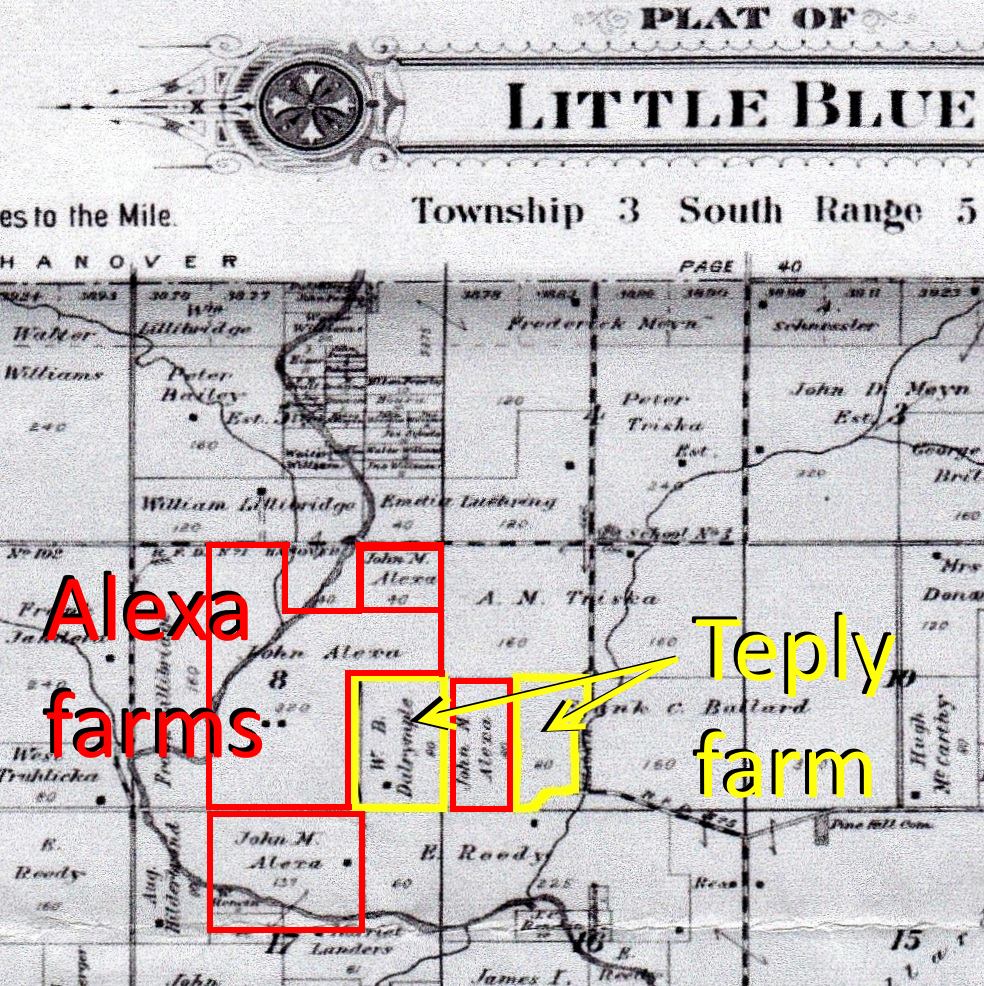 In 1909, Frank and Anna Teply bought a neighboring farm just east of the Alexa farm. They had previously rented a farm just west of Alexas. So the families knew each other well.