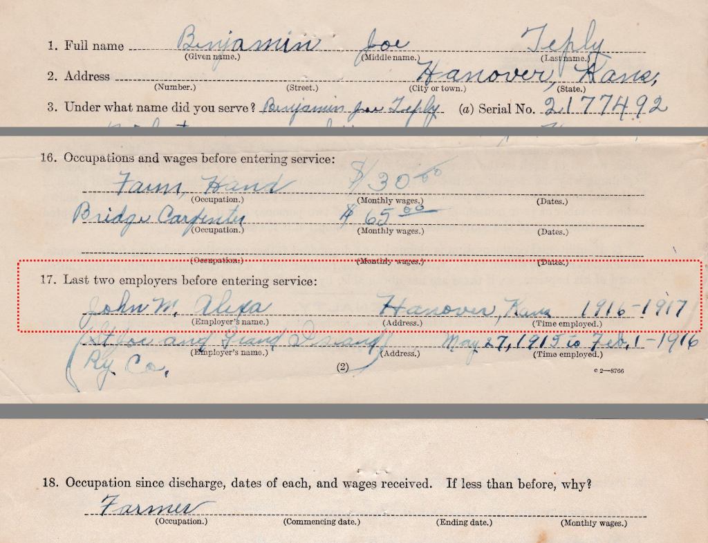 Ben Teply had been working for John M Alexa in 1916 and 1917 before the war. And he resumed working for the Alexas after he returned from the military and married.