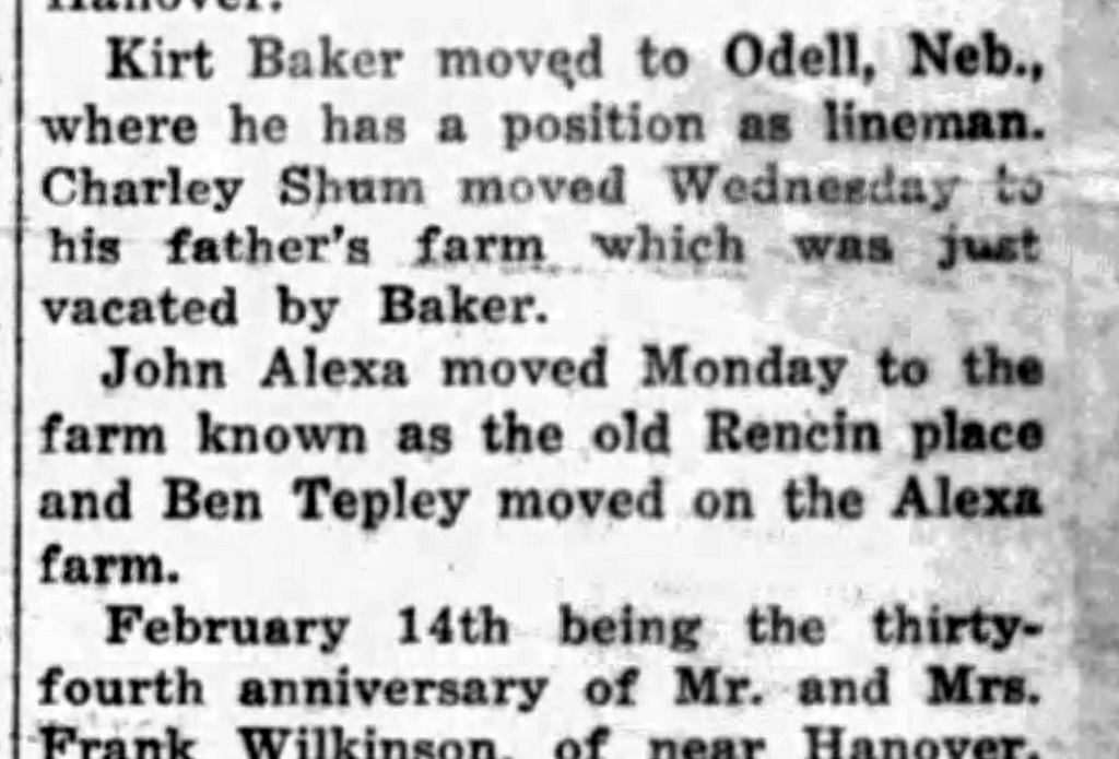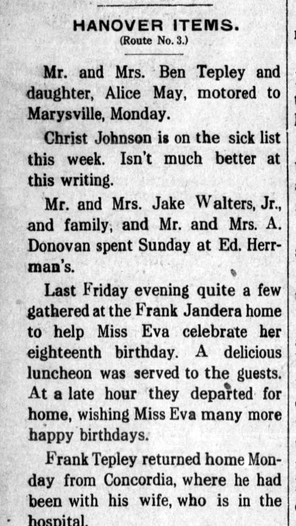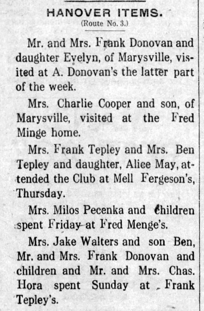 - All news articles are from The Hanover Democrat, The Hanover Herald, The Marysville Advocate, Washington Register. All are available on Newpapers.com and are free for Kansas residents – Kansas State Historical Society – https://www.kshs.org/ancestry/drivers/dlverify