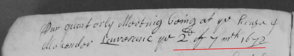 Quakers followed the English practice, with one exception. They objected to using those names of days (Sunday to Saturday) and months (January to August) which derived from pagan gods, substituting numbers. Thus Sunday was for them “First Day.” After 1752 all months were referred to by Quakers by their number. September became “Ninth Month” and so on.