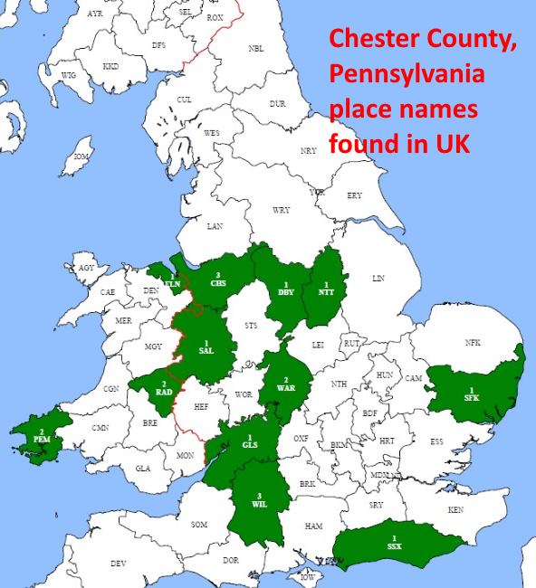 With these data, Celia has plotted the place names in Chester County, Pennsylvania that are derived from place names in England. For example, settlers in Pennsylvania may have named Chester County after Chester (Cheshire) County in England. It was popular for a settlement to be named after the immigrant’s locality in the old country.