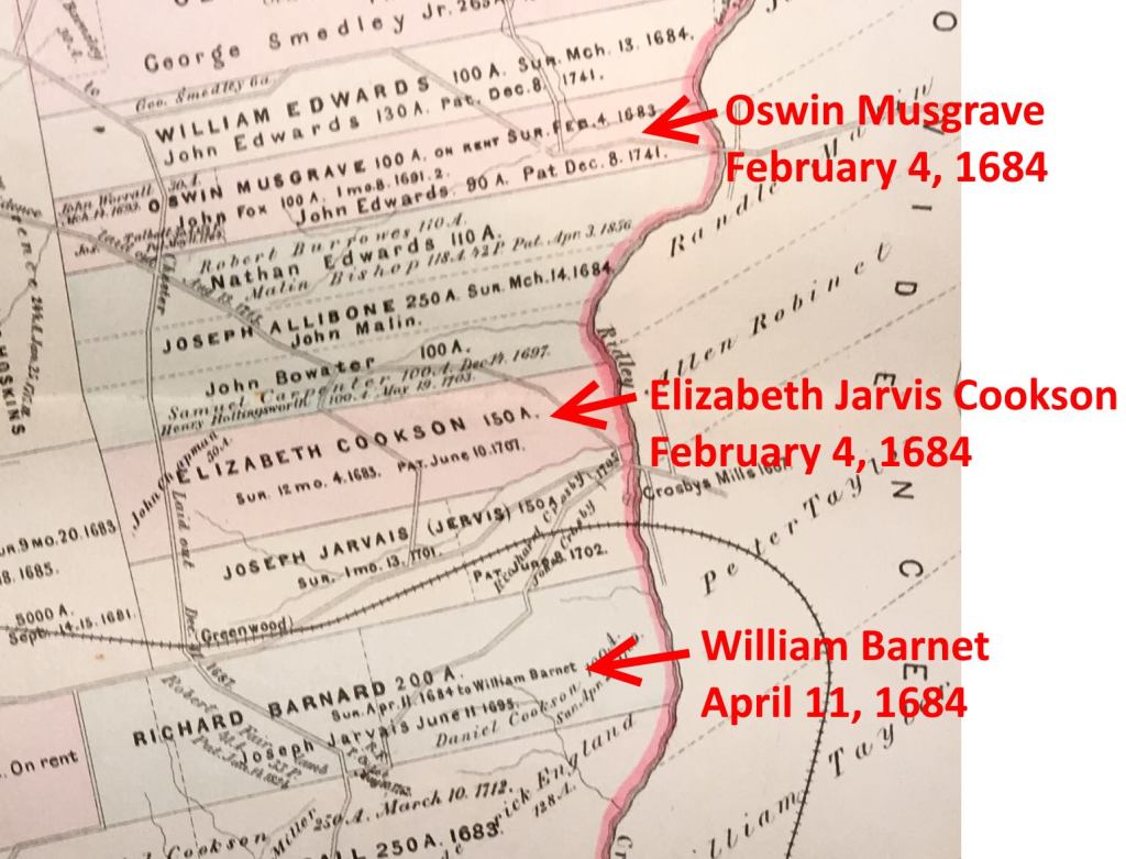 Notice that the survey dates for several of the neighbors are in the same date range as Elizabeth’s survey. Oswin Musgrave’s parcel was surveyed on the same day. So perhaps Musgrave is a contemporary.