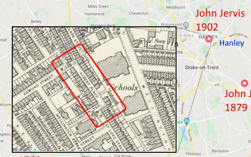 John Jervis and Edith Heath, both 21, married May 20, 1900 at Wellington Church in Hanley, Staffordshire. Witnesses were John’s brother Harry, and Elizabeth Ryan.