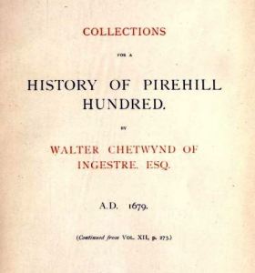 - Collections for a History of Pirehill Hundred, by Walter Chetwynd of Ingestre. Esq. A.D. 1679 (Continued from Vol. XII, p. 273. This is included in the book Collections for a History of Staffordshire Edited by the William Salt Archeological Society 1914. London: Harrison and Sons, St. Martin’s Lane, 1914