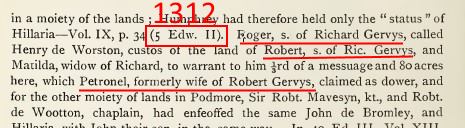 In 1286, Robert Gerveis is one of the witnesses in a court case involving land transfer from John, lord of Wetemor, to Lord Robert de Staundon. Note that most of the people aren’t referenced with surnames.