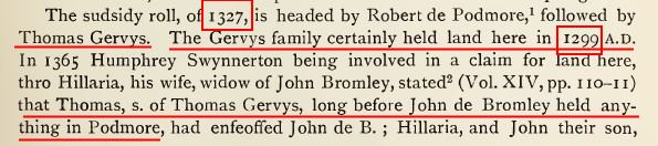The tax rolls of Podmore include Thomas Gervys, just after the lord Robert de Podmore. And Thomas was son of Thomas Gervys, who owned land here long ago. “The Geryvs family certainly held land here in 1299 A.D.”