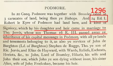 In 1296, Thomas Jervis married the daughter of Robert of Podmore, thus becoming a feudal lord. But his son Thomas sold the estate in 1343 to John, Lord of Bromley.