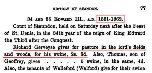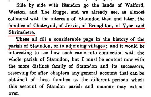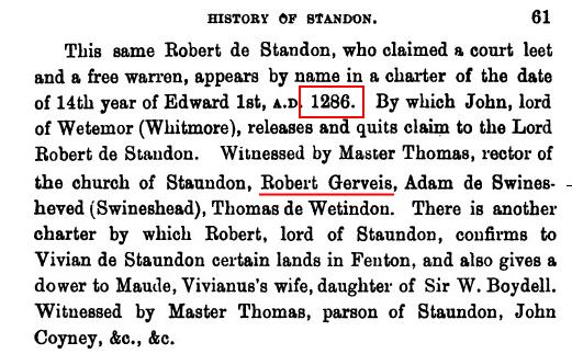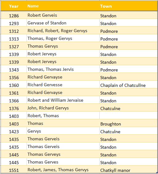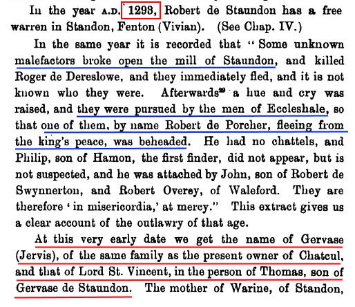 In 1293, there’s a reference to Thomas, son of Gervase de Staundon. The author associates Gervase de Staundon with the Jervis family of Chatcull and Admiral John Jervis.