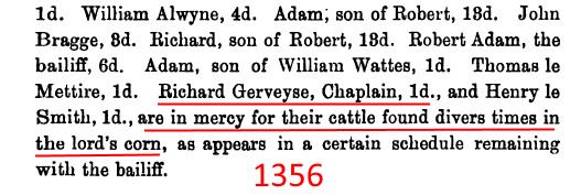 In 1356, Richard Gerveyse, Chaplain, is fined one penny because his cattle have been found several times in the lord’s corn fields. I presume he was chaplain of Standon church.