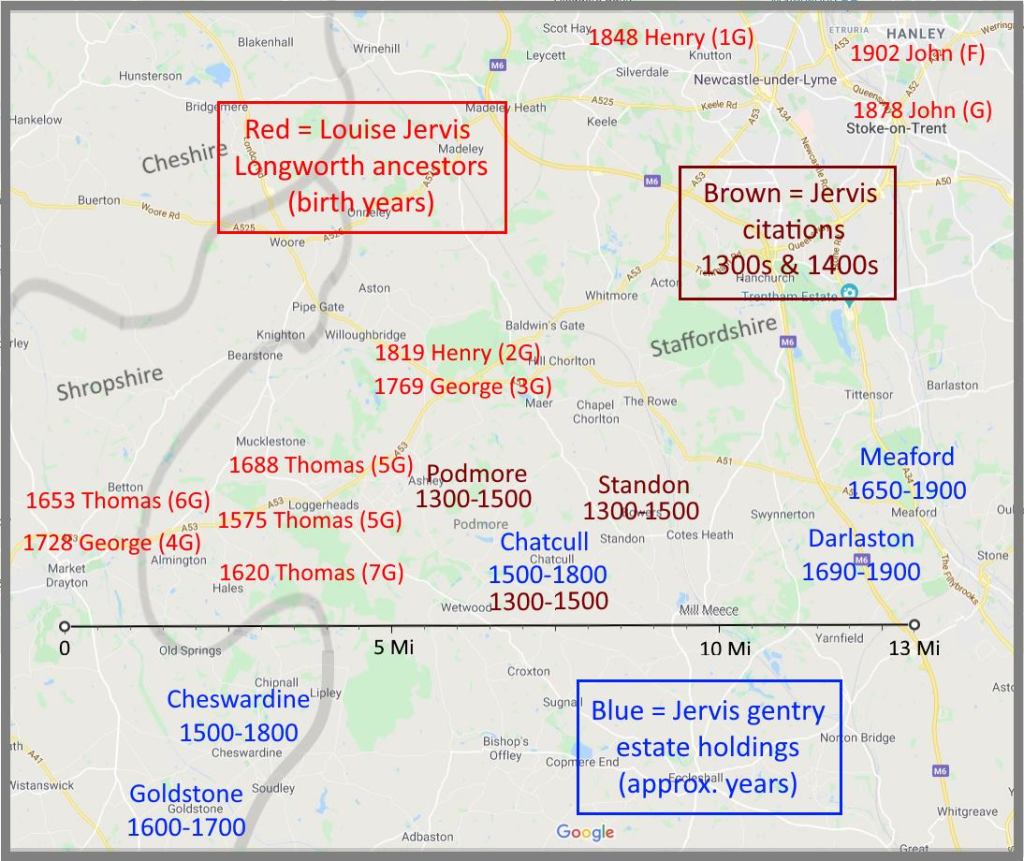 Louise’s ancestors were born and lived within five miles of Chatcull for two hundred years, back to 1600. So it’s likely they are related to the Chatcull Jervises.