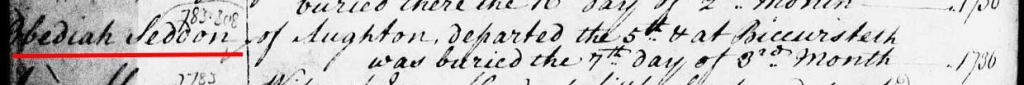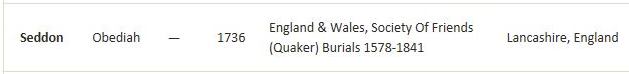 - Obediah Seddon burial citation – RG6 / 1616 – England & Wales, Society of Friends (Quaker) Burials 1578-1841 Image – https://www.findmypast.com/