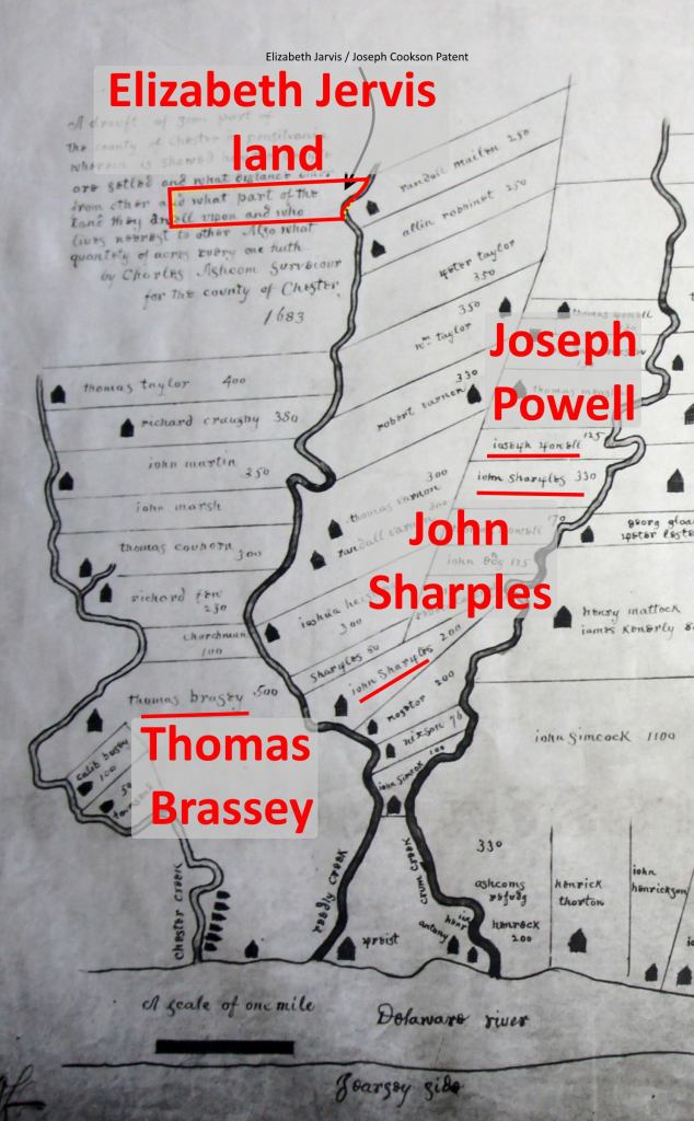 They are (later) neighbors of Elizabeth Jervis in Pennsylvania. Here they are on Charles Ashcom’s surveyor map of 1683.