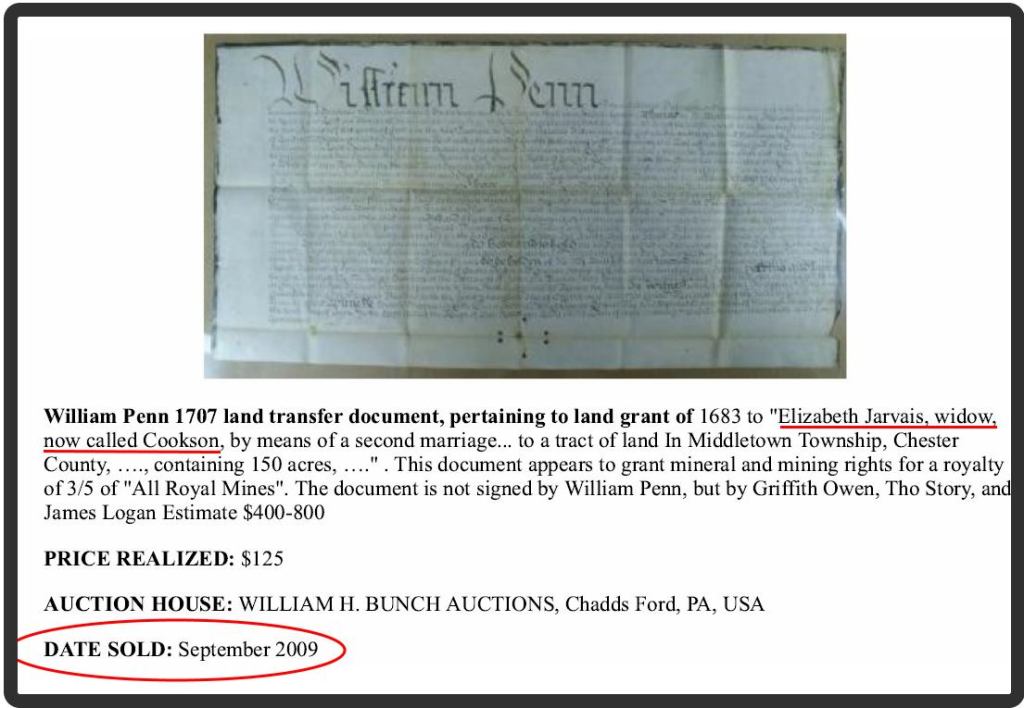 - Patent – Elizabeth Jarvis Cookson – Middletown 150a – 1707 – Patent Book A4 Page 15 – Pennsylvania State Archives, Harrisburg, PA
