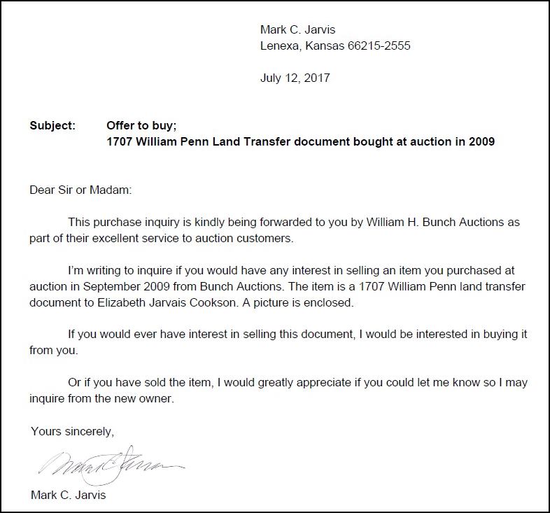 - Letter – Offer to Buy Elizabeth Cookson Patent – Mark Jarvis – July 2017