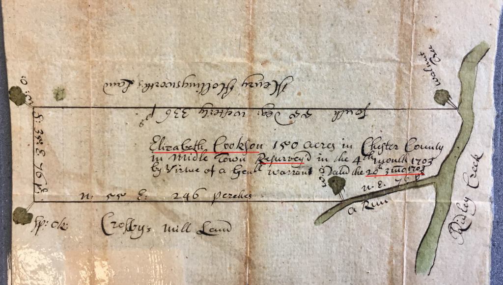- Re-Survey – Elizabeth Cookson – Middletown 150a – 1703 – Book D-36 Page 168 – State Archives of Pennsylvania, Harrisburg, PA