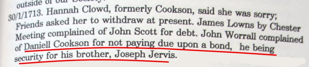 - Quaker minutes – Joseph Jervis and Daniel Cookson – bond – 1713 – Book – Early Church Records of Delaware County Pennsylvania – Volume 1 – P. 93
