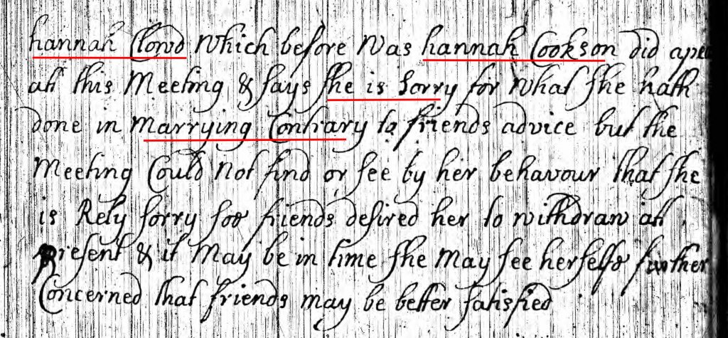 - Quaker acknowledgment – Hannah Cookson Cloud – 1713 – U.S., Quaker Meeting Records, 1681-1935 – Ancestry.com