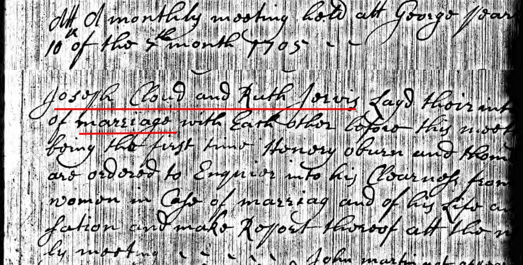 At the monthly meetings in September and October 1705, Ruth Jervis and Joseph Cloud, Jr. announced their intentions to marry. By the November meeting, it was recorded that the marriage was done.