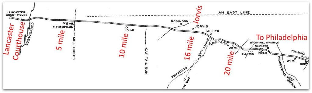 The best bet was the route along old Peter’s Road (Bezaillion’s trading road). That road went from Philadelphia and Chester west to White Horse, but then turned northwest and bypassed Lancaster. So a new road was surveyed from Lancaster to White Horse, and the old road would be used from White Horse to Philadelphia.
