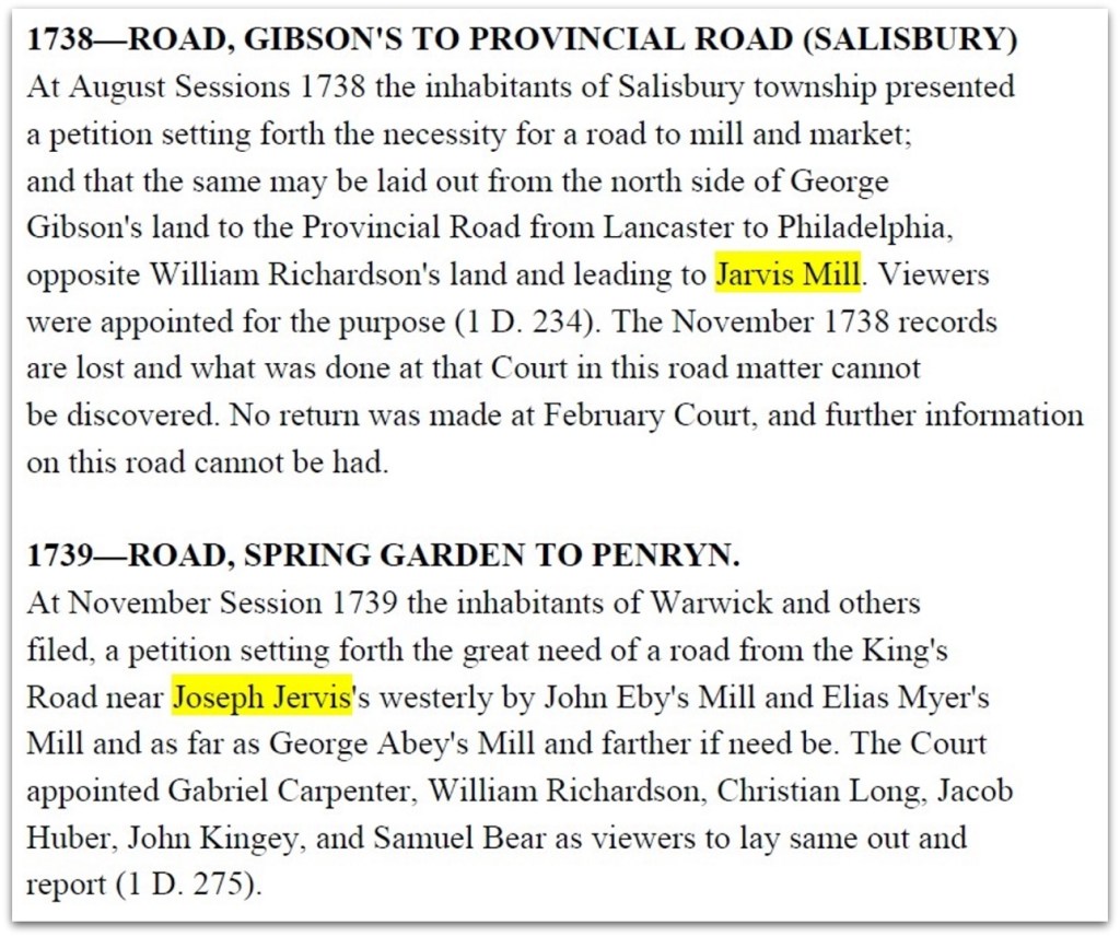 - References to Joseph Jervis and Jervis Mill in Road Reports – History of Lancaster County’s Highway System – Lancaster County Historical Society