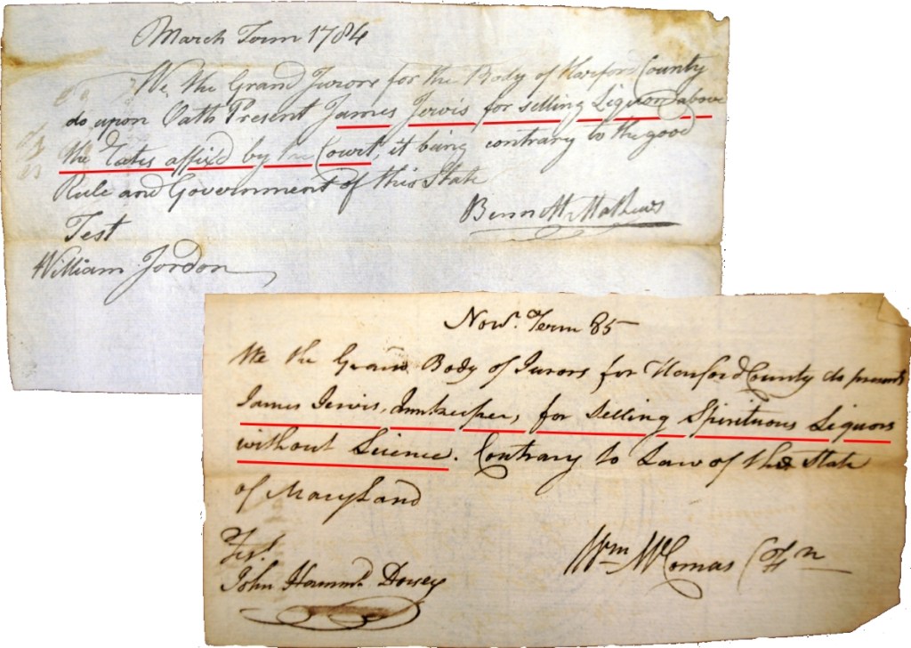 - Court Citations – James Jervis – Liquor infractions – 1784, 1785 – Harford County Historical Society – Bel Air, Maryland