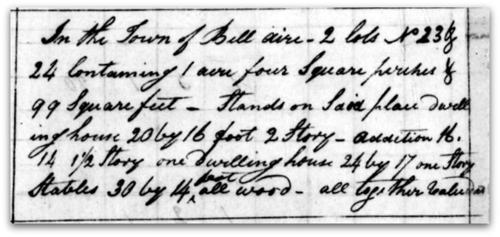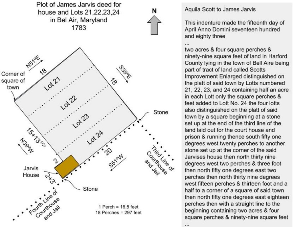 On April 15, 1783, James and Elizabeth bought their house and four lots 21-24 in the new town of Bel Air from Aquilla Scott. The price was £35.