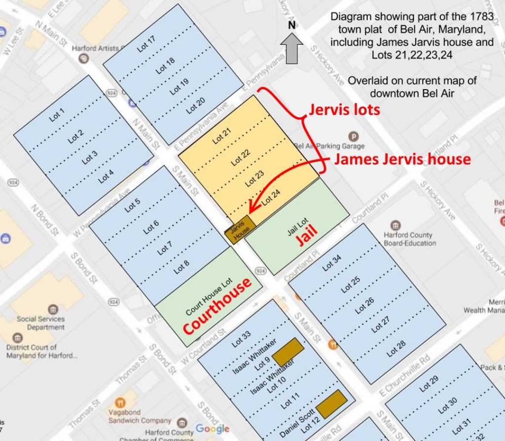 Here are the lots overlaid on a current map of downtown Bel Air. It’s interesting that the Jarvis house stuck out into the middle of Main Street, because it pre-dated the town plan.