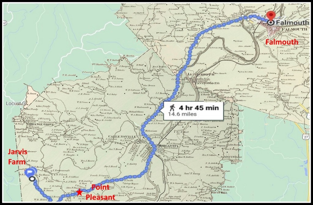 Falmouth was fifteen miles away from the Jarvis homestead, more than a five hour walk. But Monroe sometimes held his monthly service at Point Pleasant, about nine miles southwest of Falmouth. The Jarvises were close to Point Pleasant, so they became acquainted with his preaching there.