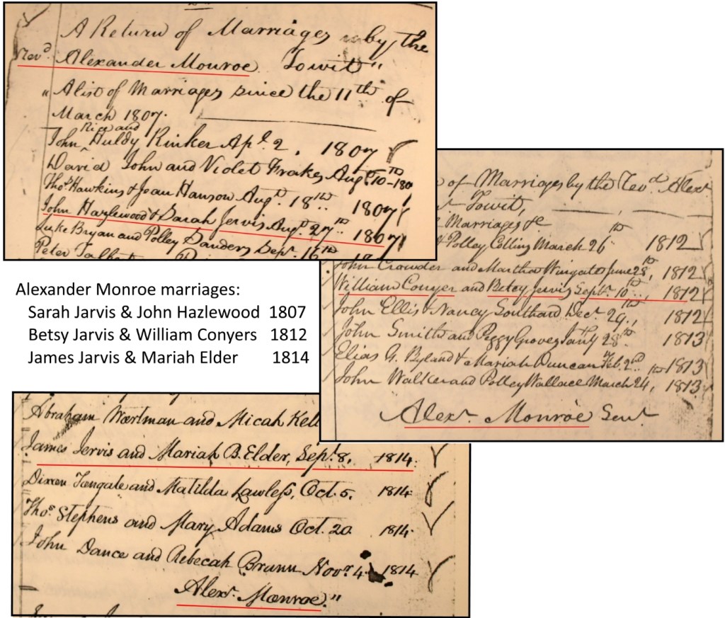 Alexander Monroe was the officiant at the marriages of the first three Jarvis children – Sarah in 1807, Elizabeth in 1812, and James in 1814.
