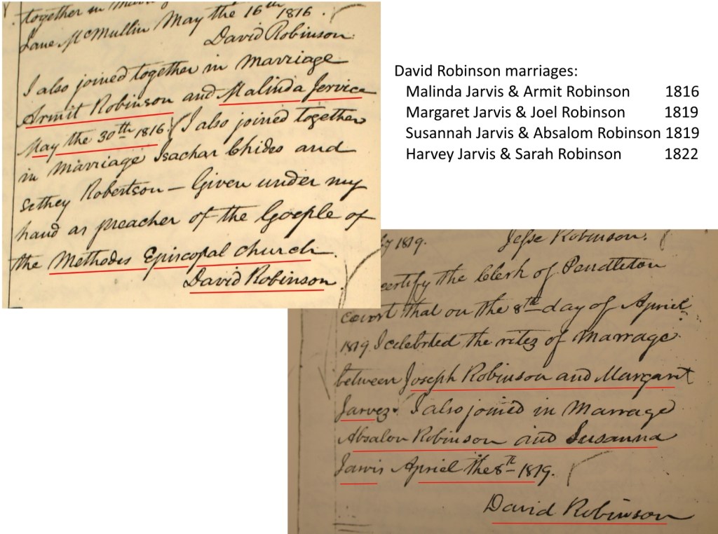 David Robinson presided at four Jarvis weddings – Malinda in 1816, Susannah and Margaret in 1819, and Harvey in 1822.