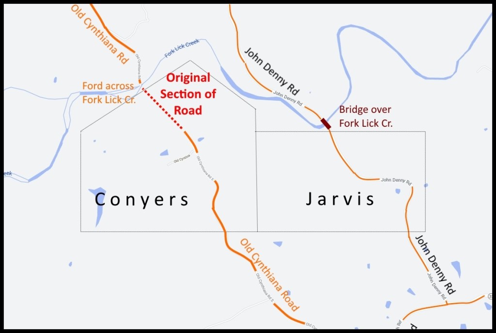 The road today doesn’t ford the creek. There’s another road a mile east, John Denny Road, that has a bridge over Fork Lick Creek.