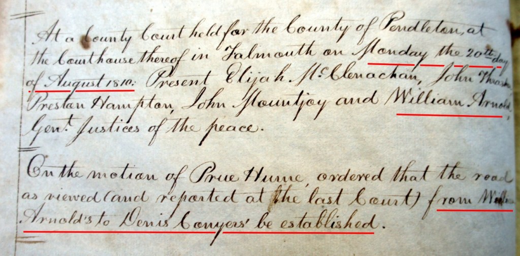 In 1810, the court ordered Dennis Conyers “to view and mark out a road the nearest and best way from William Arnold to Dennis Conyers.” In June, Conyers reported that he had done so.