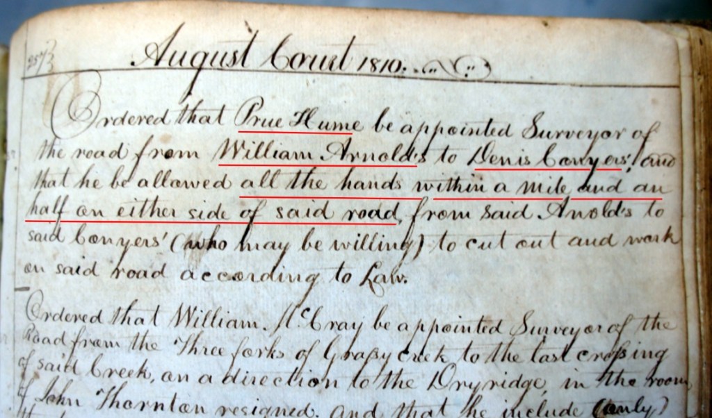 At the same August 1810 session, the court appointed Prue Hume as surveyor of the road from William Arnold’s to Dennis Conyers and allowed Hume all the hands within a mile and a half on either side of the road.