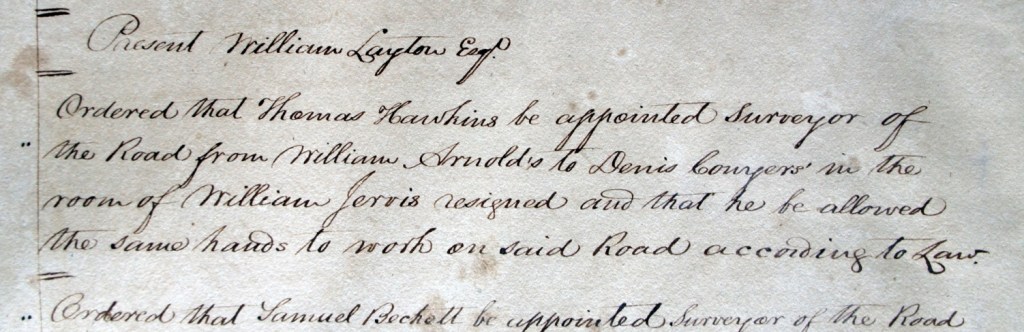 Seven years after the road was ordered, and four years after he was appointed surveyor, William Jarvis resigned. The court “Ordered that Thomas Hawkins be appointed surveyor of the Road from William Arnold’s to Dennis Conyers in the room of William Jarvis resigned and that he be allowed the same hands to work on said road according to law.“