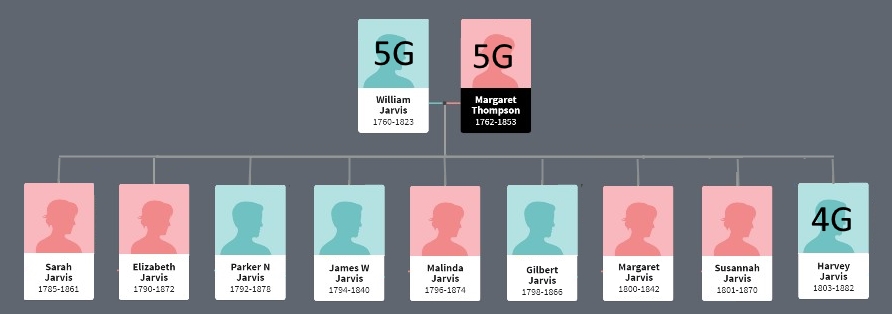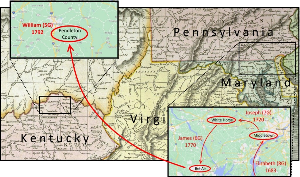 In addition to their two daughters born in Maryland, William and Margaret had seven more children in Kentucky. Our grandfather Harvey (4G) was the youngest, born in 1803.