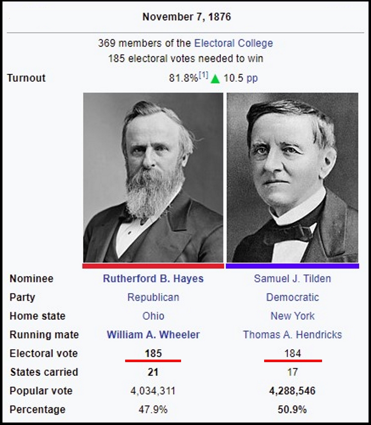 Sound familiar? Yes, but this was the presidential election of 1876. Samuel Tilden won the popular vote over Rutherford Hayes. But in four southern states, each party submitted its own slate of electors. So neither candidate had the 185 electoral votes needed to win.
